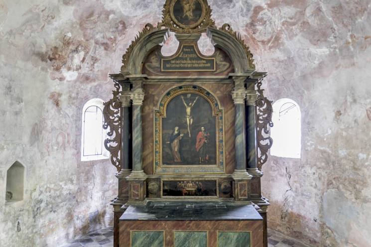Bei Restaurierungsarbeiten 1933–36 wurden in der Apsis Fresken zum Teil aus dem Barock freigelegt. Sie stellen Evangelisten und das Jüngste Gericht dar, Gott blickt mahnend über dem Altar herab. Die Fenster im Chor zeigen Luther und Melanchthon. Zwei kleine Grabplatten, ehemals Bodenplatten, mit den Daten 1587 und 1609 sind an der Südseite in die Wand eingelassen, ebenso ein Epitaph für Wolf Adam von Wallwitz aus dem 17. Jahrhundert. Die Westseite des mächtigen Turmes wurde 1958 nach einem Teileinsturz vollständig neu errichtet. Im Eingangsbereich sind zwei Steine eingelassen mit Abschürfungen und Rillen, die sogenannten Rittersteine. Sie wurden wohl von den ansässigen Rittern genutzt, um symbolisch ihre Waffen abzustumpfen.